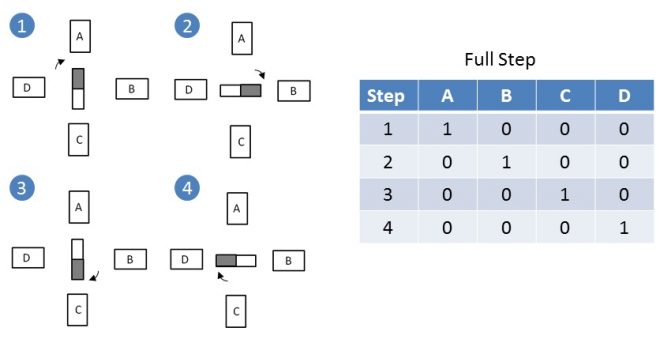 Gambar di atas sebelah kiri adalah arah putaran rotor motor stepper dan sebalah kanan adalah logic phase pada setiap step. contoh bentuk pulsa yang diberikan pada kumparan untuk menggerakkan motor stepper pada arah sesuai dengan jarum jam (clockwise). Jika diperhatikan, signal pulsa seolah – olah berjalan dari phase A ke phase B dan seterusnya. Sehingga bagian rotor yang diibaratkan seperti magnet akan berputar karena tertarik oleh gaya magnet yang dibangkitkan oleh setiap phase. Pemberian signal seperti di atas adalah metode full step, sehingga untuk 1 putaran penuh dibutuhkan 4 kali step.